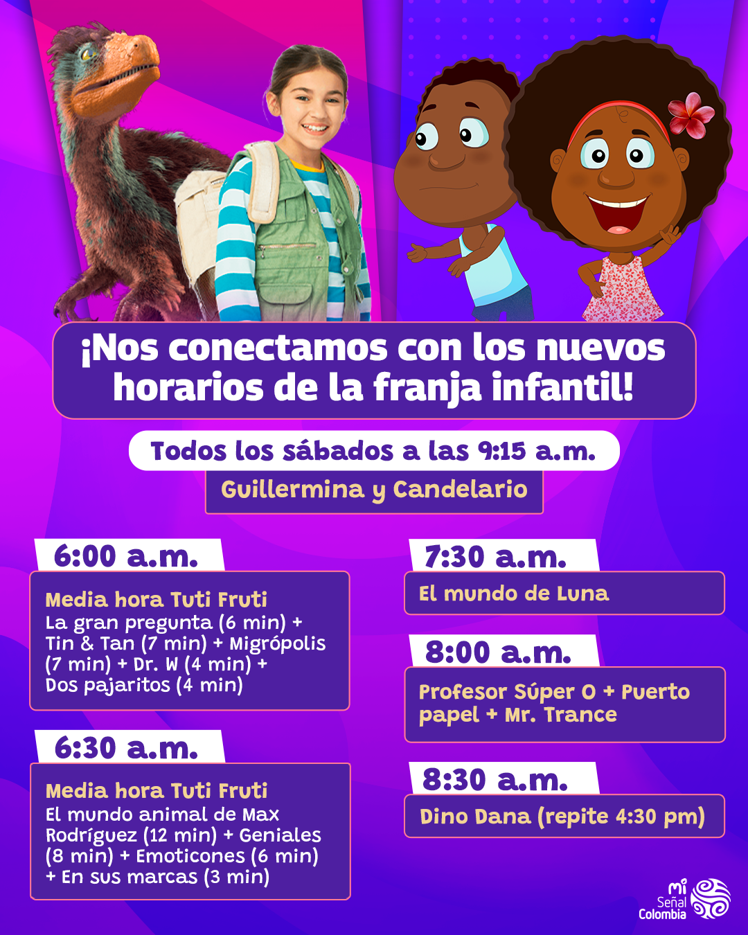En febrero llegan nuevos estrenos a la franja infantil de Mi Señal. Empezamos este sábado 4 a las 9:15 a.m. con la sexta temporada de Guillermina y Candelario y el lunes 6 de febrero con Dino Dana a las 8:30 a.m.